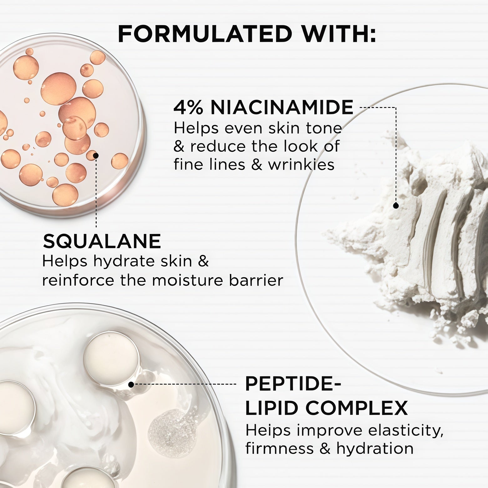 AQUA / WATER / EAU, GLYCERIN, NIACINAMIDE, CETEARYL ALCOHOL, HYDROXYETHYLPIPERAZINE ETHANE SULFONIC ACID, GLYCERYL STEARATE, SQUALANE, DIMETHICONE, MYRISTYL MYRISTATE, ETHYLHEXYL PALMITATE, BUTYROSPERMUM PARKII BUTTER / SHEA BUTTER, PHENOXYETHANOL, PEG-100 STEARATE, CAPRYLYL GLYCOL, SODIUM POLYACRYLATE, TOCOPHEROL, CITRIC ACID, SODIUM HYALURONATE, CAPRYLIC/CAPRIC TRIGLYCERIDE, PENTYLENE GLYCOL, PENTAERYTHRITYL TETRA-DI-T-BUTYL HYDROXYHYDROCINNAMATE, HYDROLYZED RICE PROTEIN, CERAMIDE NP, ADENOSINE, TRISODIUM ETHYLENEDIAMINE DISUCCINATE, COLLOIDAL OATMEAL, HYDROXYPALMITOYL SPHINGANINE, BUTYLENE GLYCOL, LIMONENE, CARAMEL, CITRAL, LINALOOL, CARBOMER, SODIUM LACTATE, POLYSORBATE 20, PALMITOYL TRIPEPTIDE-1, PALMITOYL TETRAPEPTIDE-7, PARFUM / FRAGRANCE.